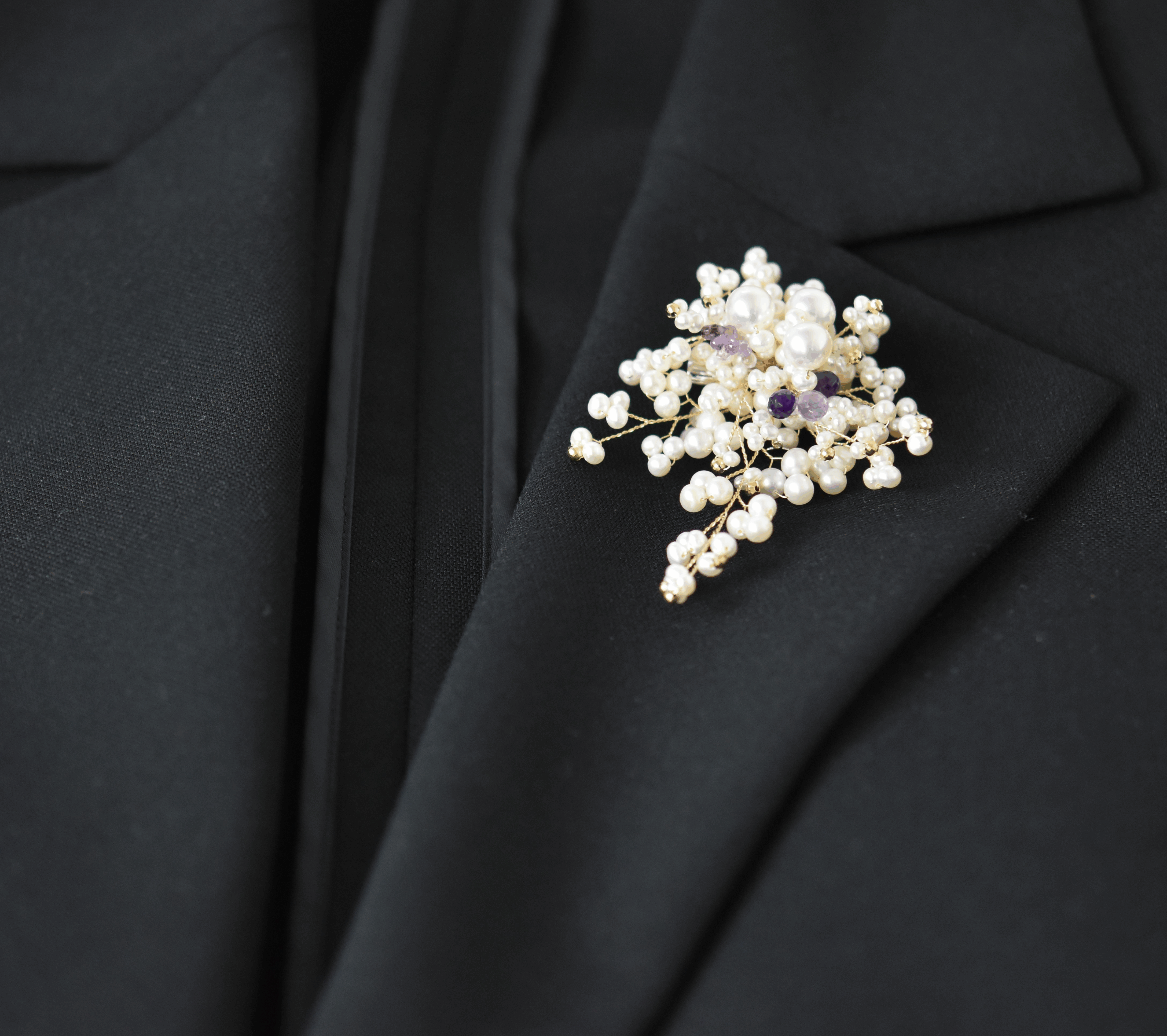 「里に咲く、小さな花たち」をイメージした一つ一つ手作りした「千こ里花・藤」と名前の付いたオリジナルブローチです。ボリュームがありながらも品のある本物のコサージュ。特注金具で胸元にピタッと張り付く形でお付けいただけます。さらには、付属のジョイント金具で豪華なネックレストップとしてもお使いいただけます。