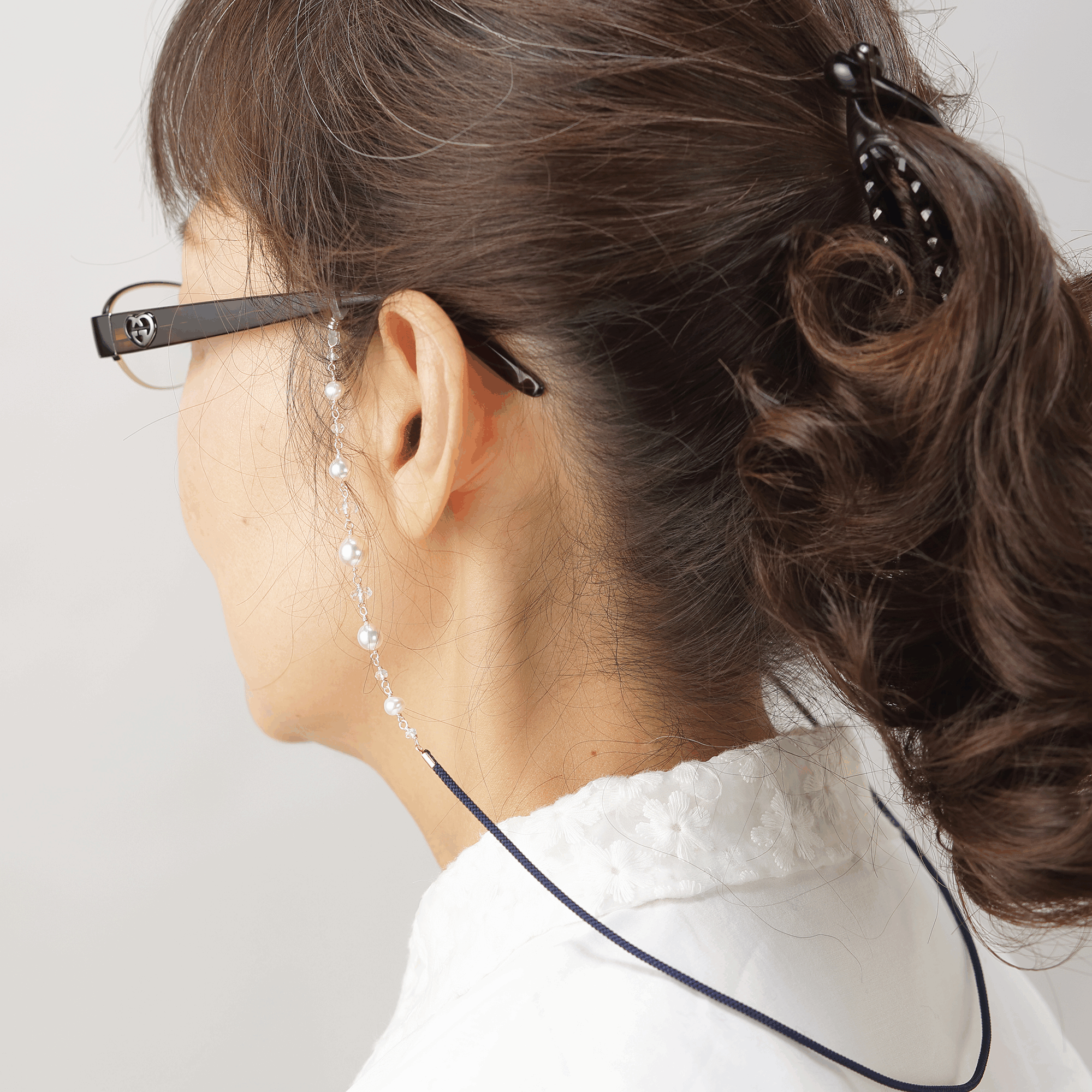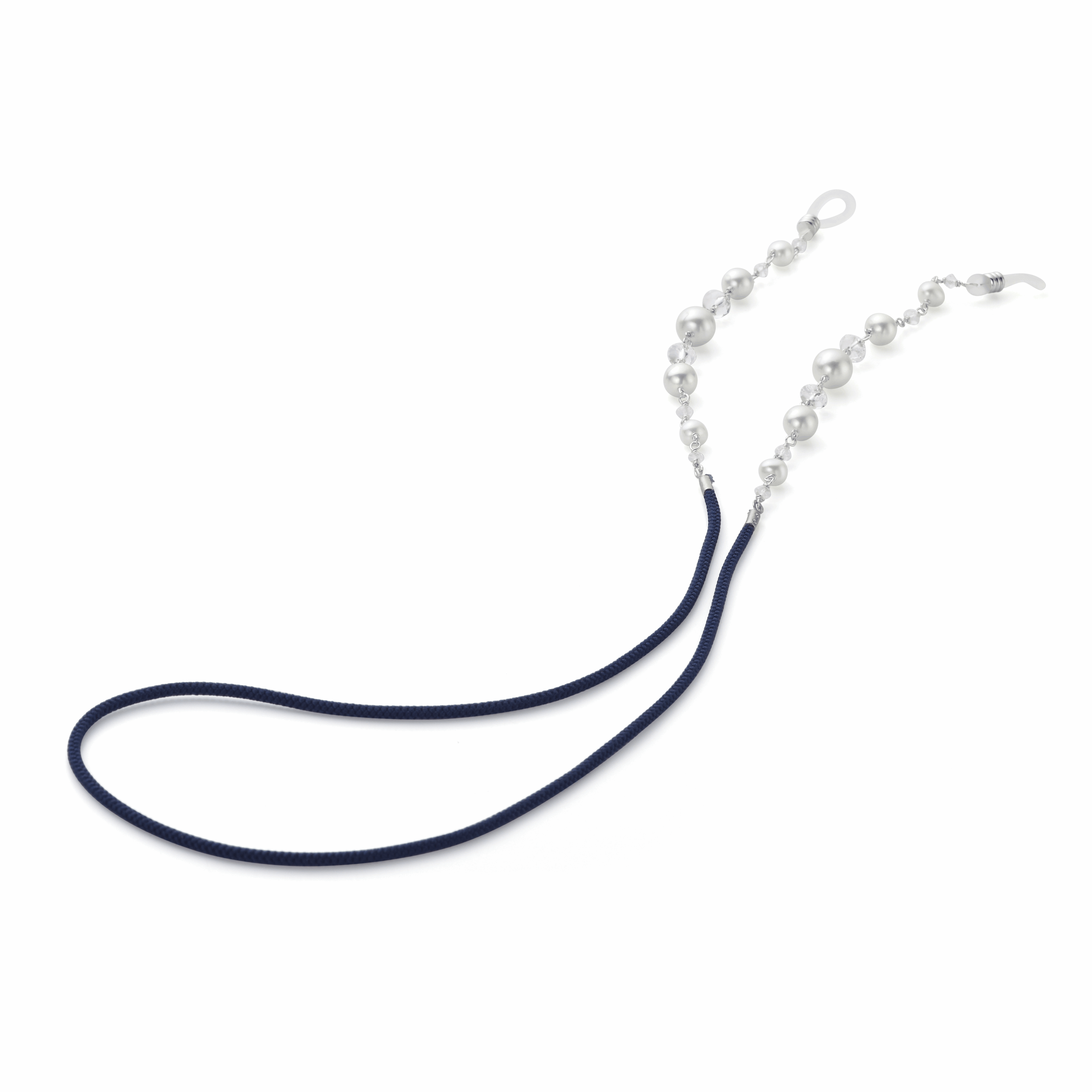 照りの良い真珠と水晶がキラキラと輝くメガネホルダーです。京都産の組紐を使用しているので、結びじわが付きにくく、チェーンのように堅くからまる心配もありません。メガネをかけたり外したりの煩わしさから解放されます。(※メガネはイメージです。付属品ではございません)