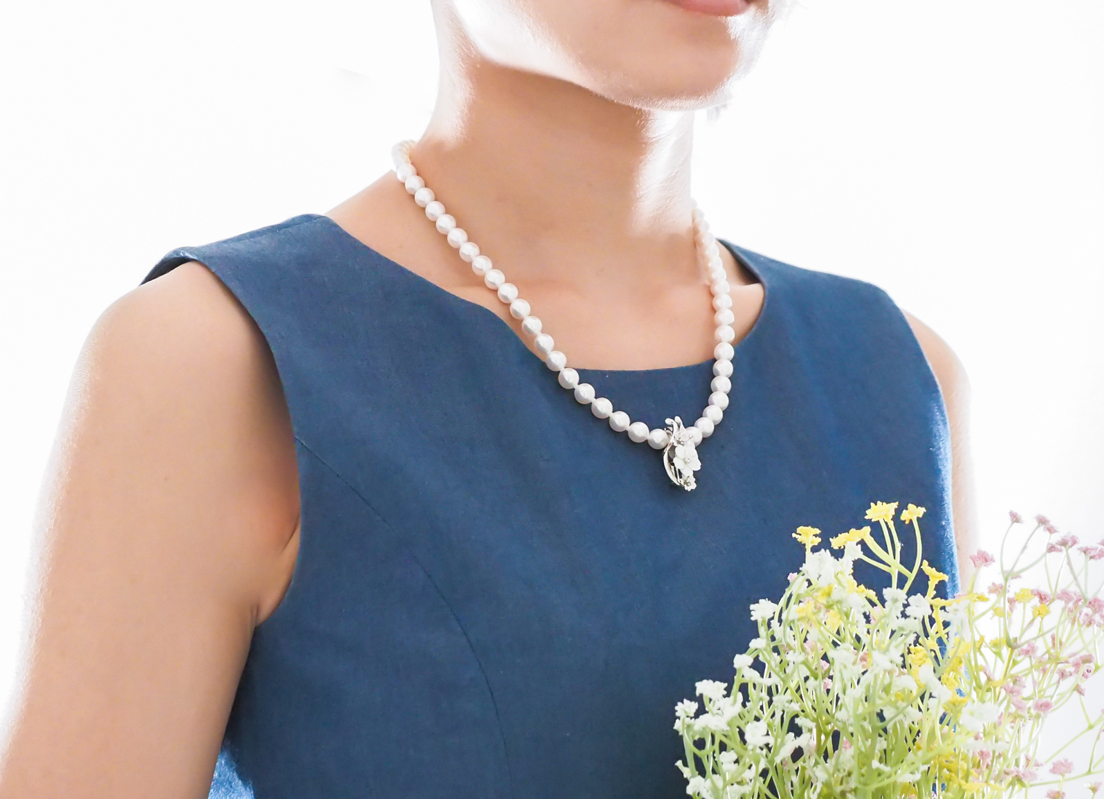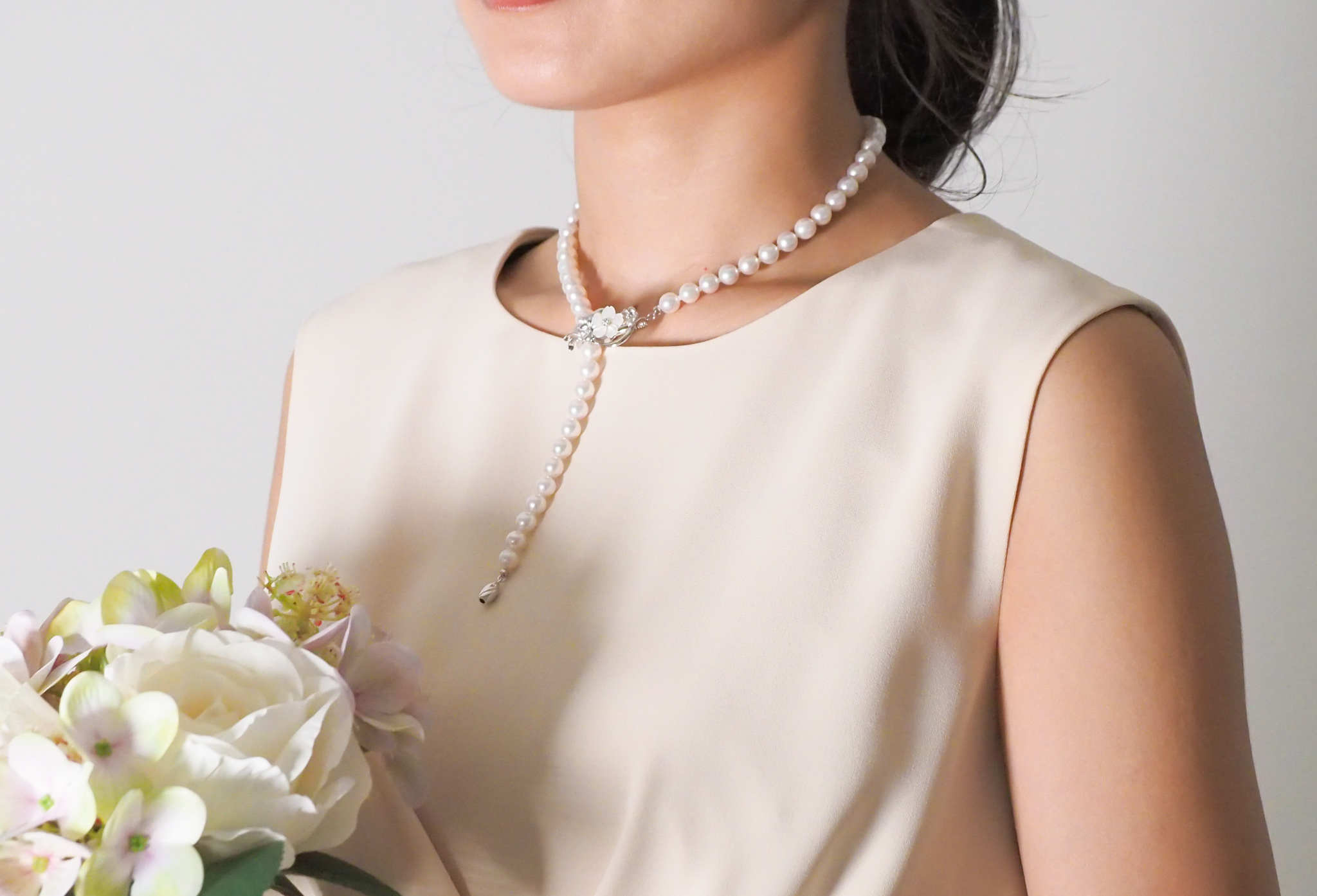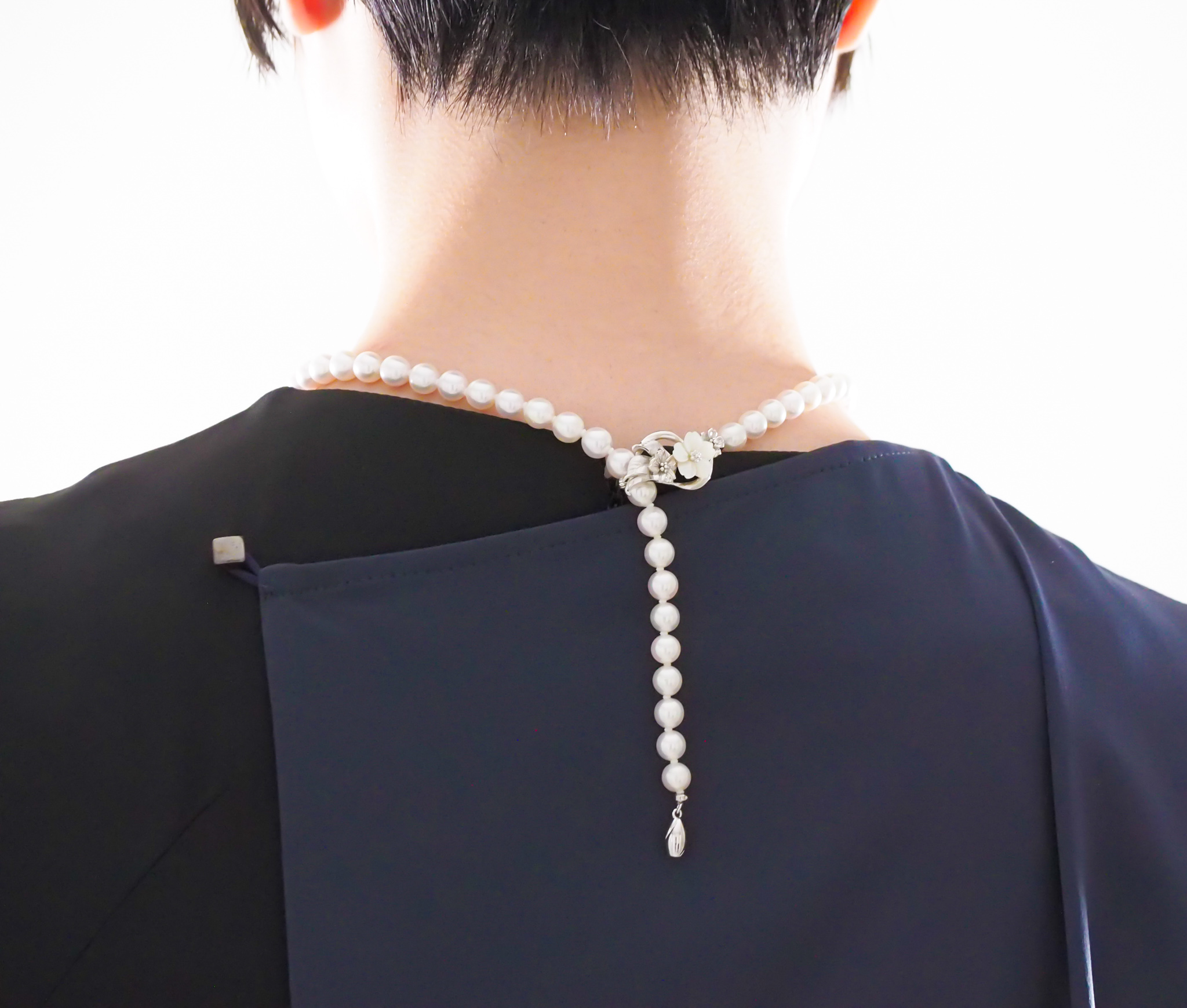 「フレックス パール」と名前を付けた、その場面場面に臨機応変に対応できる真珠ネックレスです。Y字型のおしゃれ用真珠ネックレス、トップ付きの真珠ネックレスさらにはシンプルな一連の冠婚葬祭用真珠ネックレスとして、3通りに形を変えて使用できます。もちろん巻き照りのしっかりした一生ものとしてお使いいただける高品質のあこや真珠を使用しています。たくさんの機会でお使いいただけますので、1本持たれると大変重宝します。