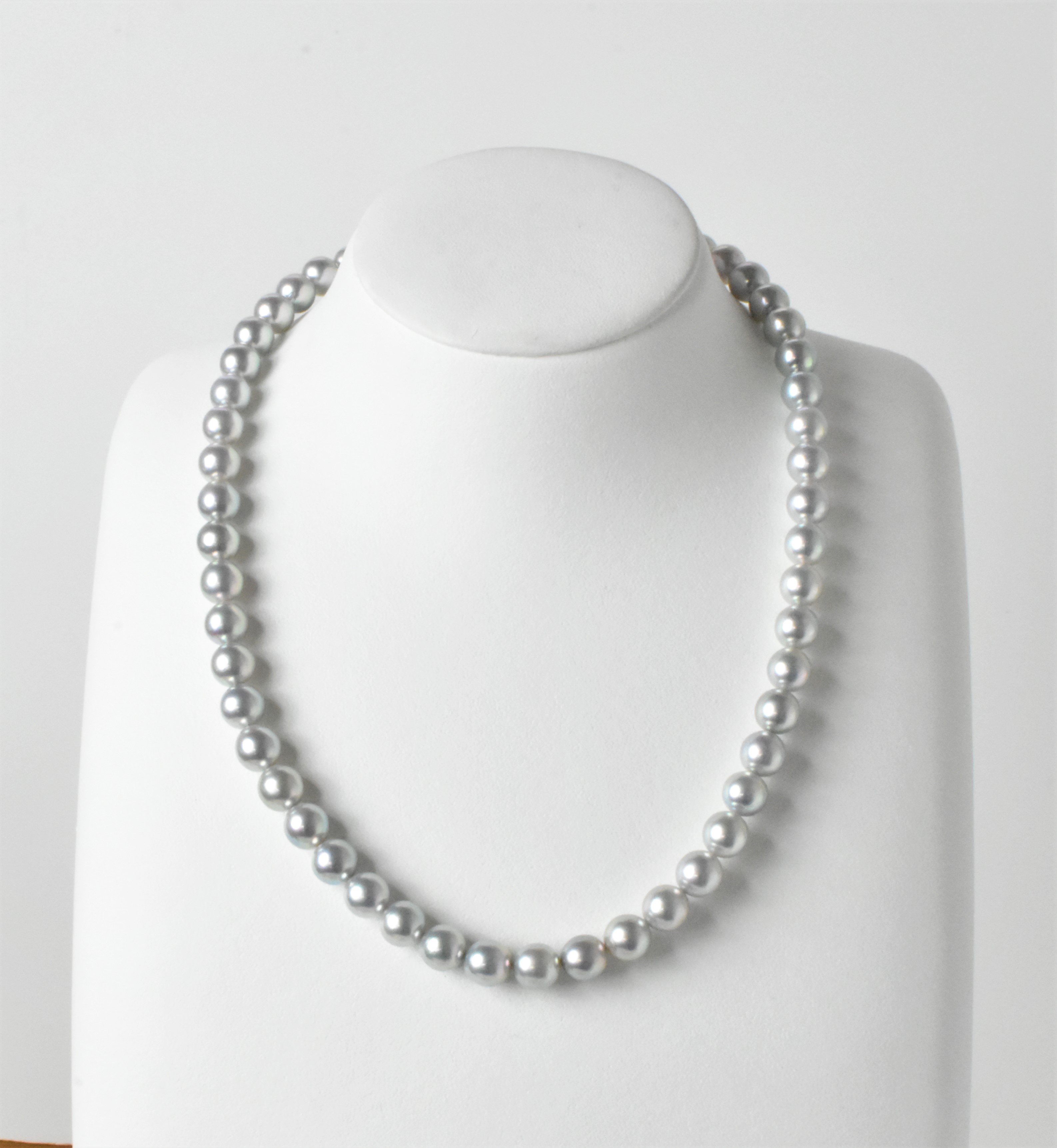 あこやグレー真珠は、お悔みの席ではもう定番となりましたが、普段のおしゃれ用としてもお使いいただけます。白のあこや真珠と場面やお洋服によって使い分けてください。巻きと照りのしっかりしたトップ品質の真珠を厳選していますので一生ものとして綺麗に長くお使いいただけます。