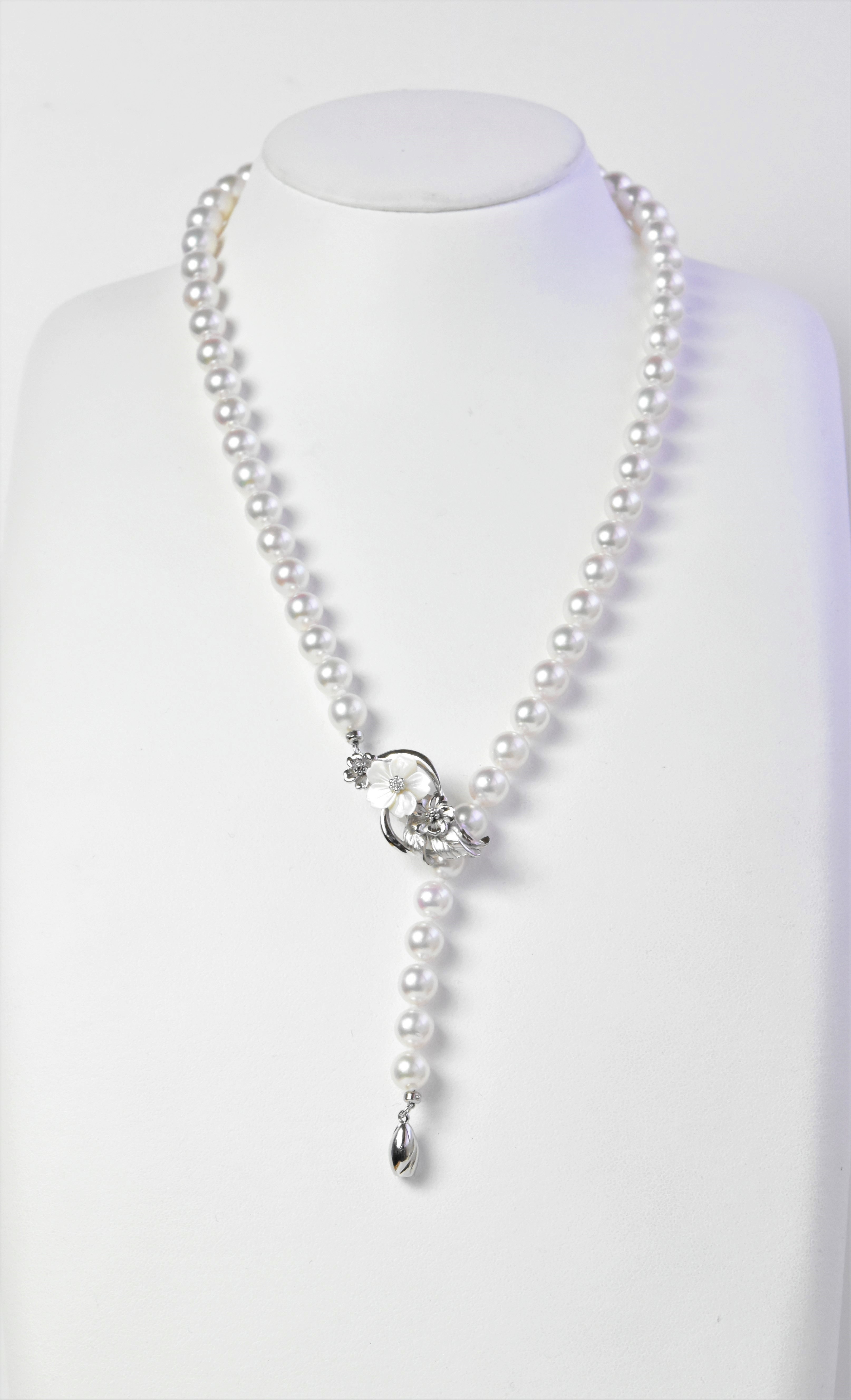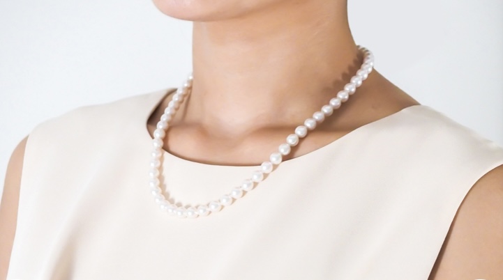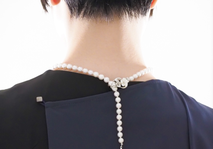 「フレックス パール」と名前を付けた、その場面場面に臨機応変に対応できる真珠ネックレスです。Y字型のおしゃれ用のネックレス、トップ付きの真珠ネックレスさらにはシンプルな一連の冠婚葬祭用真珠ネックレスとして、3通りに形を変えて使用できます。もちろん巻き照りのしっかりした一生ものとしてお使いいただける高品質のあこや真珠を使用しています。たくさんの機会でお使いいただけますので一本持たれると大変重宝します。
