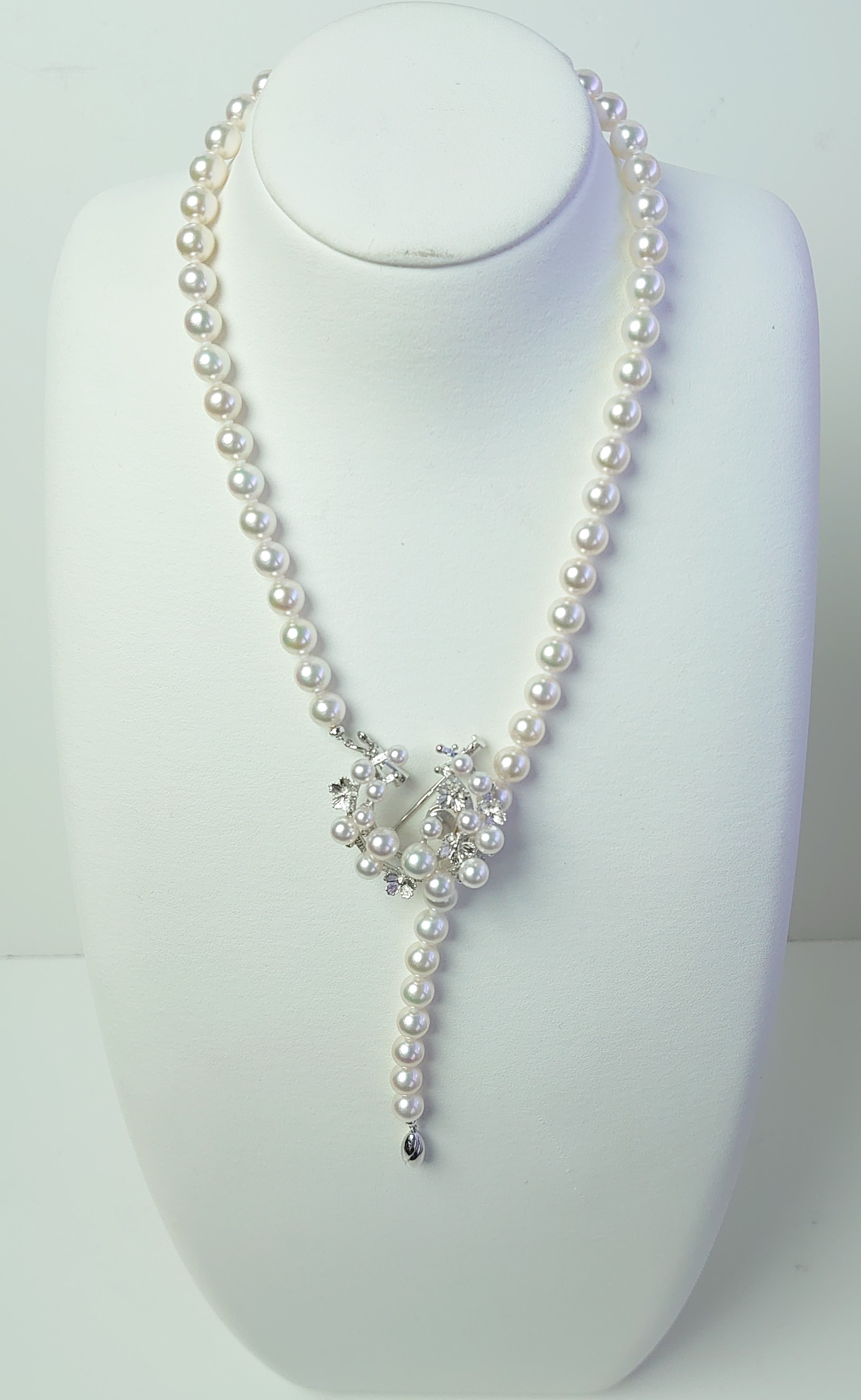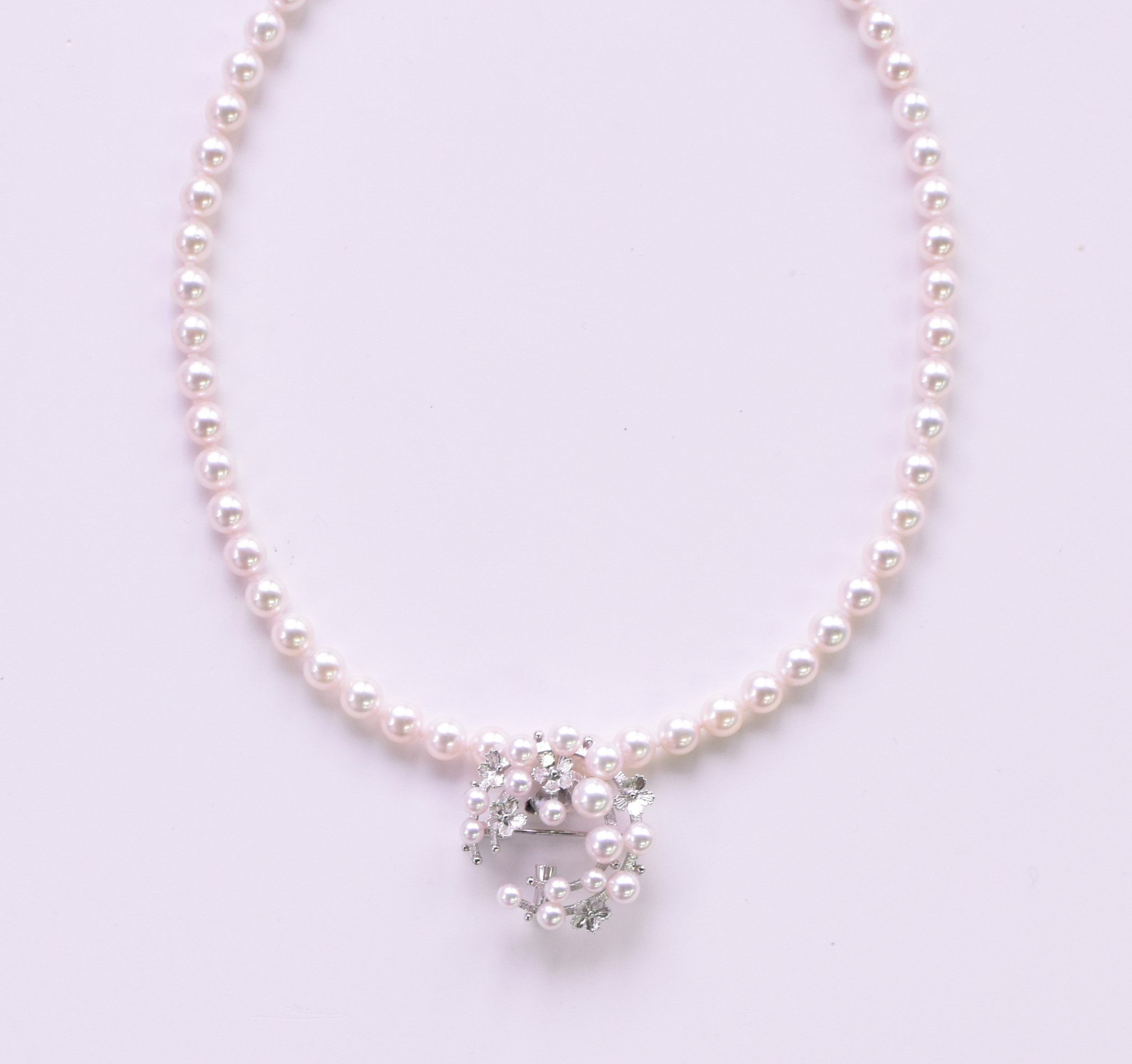 フジモトオリジナルデザインの¨プレミアムフレックスパ―ル¨と名付けた4WAYネックレスです。豪華なY字型ネックレス・通常の冠婚葬祭用ネックレス・トップ付ネックレス・桜デザインのブローチと、4通りに使えます。もちろん真珠は高品質の真珠を使用しておりますので、一生ものとして長く色々な場面で活躍してくれます。
