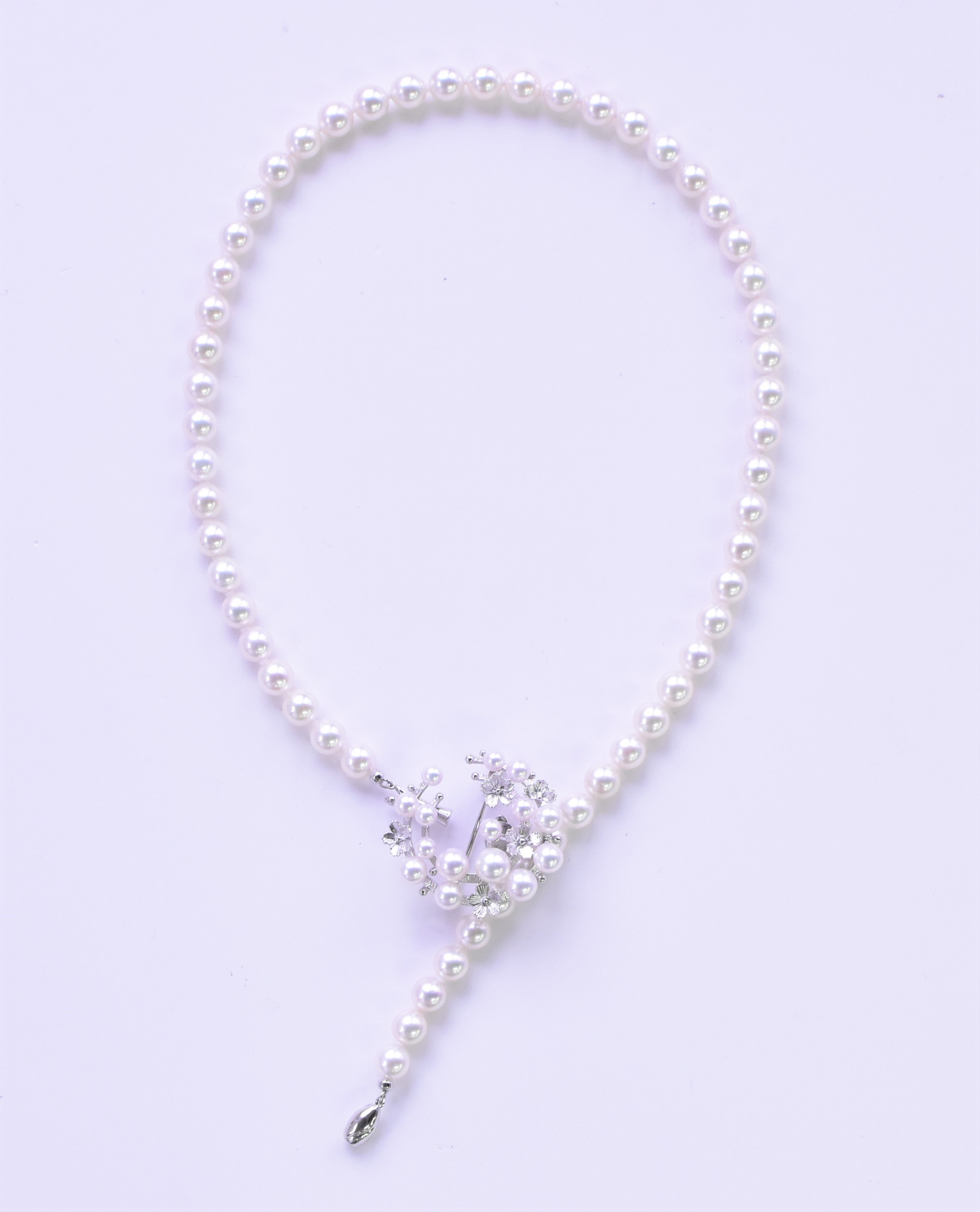 フジモトオリジナルデザインの¨プレミアムフレックスパール¨と名付けた4WAYネックレスです。豪華なY字型ネックレス・通常の冠婚葬祭用ネックレス・トップ付ネックレス・桜デザインのブローチと、4通りに使えます。もちろん真珠は高品質の真珠を使用しておりますので、一生ものとして長く色々な場面で活躍してくれます。