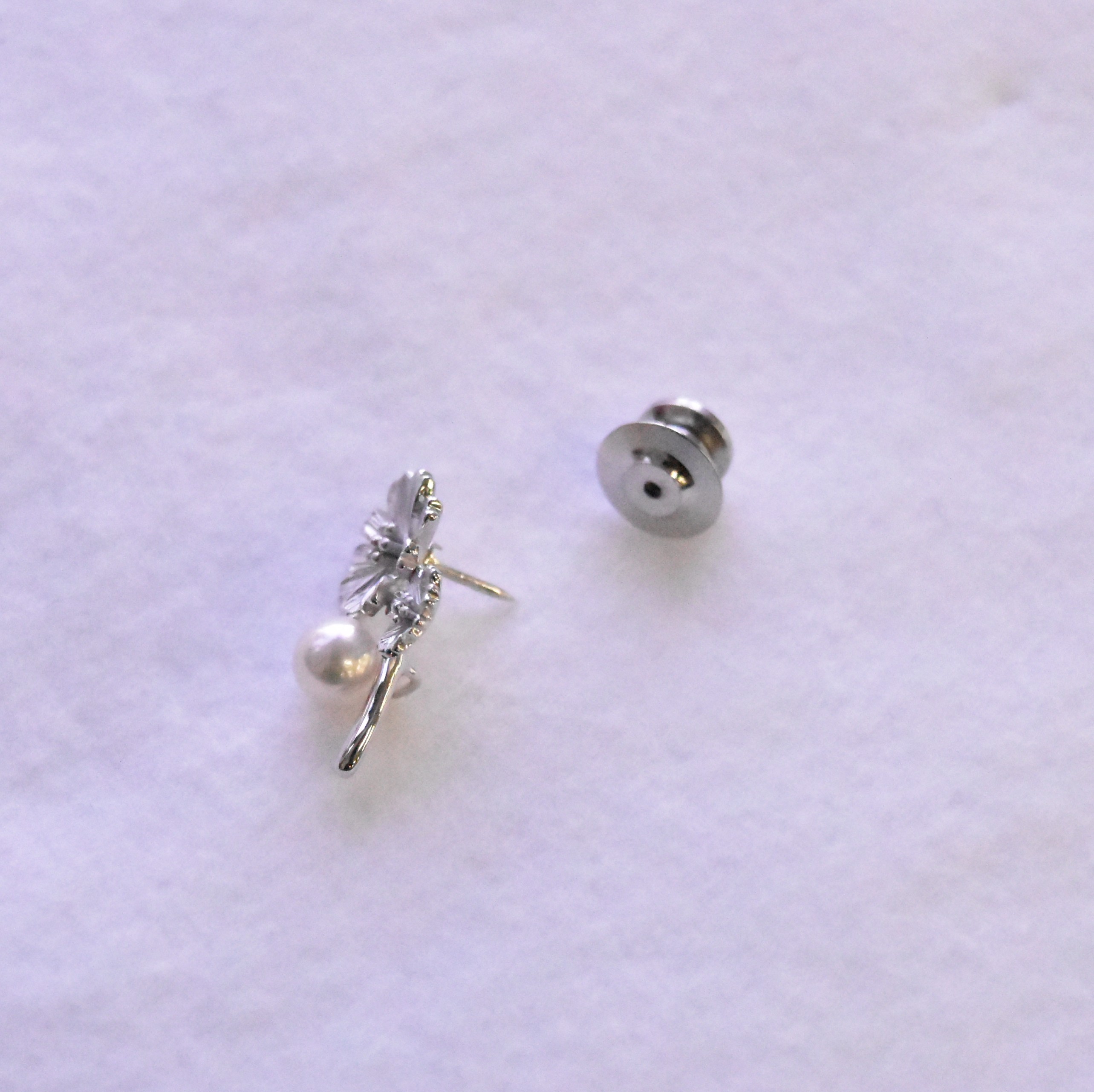 寄り添うように咲く二輪の花をモチーフにひと粒のパールを添えて、控えめながらも温かみのある印象を閉じ込めました。