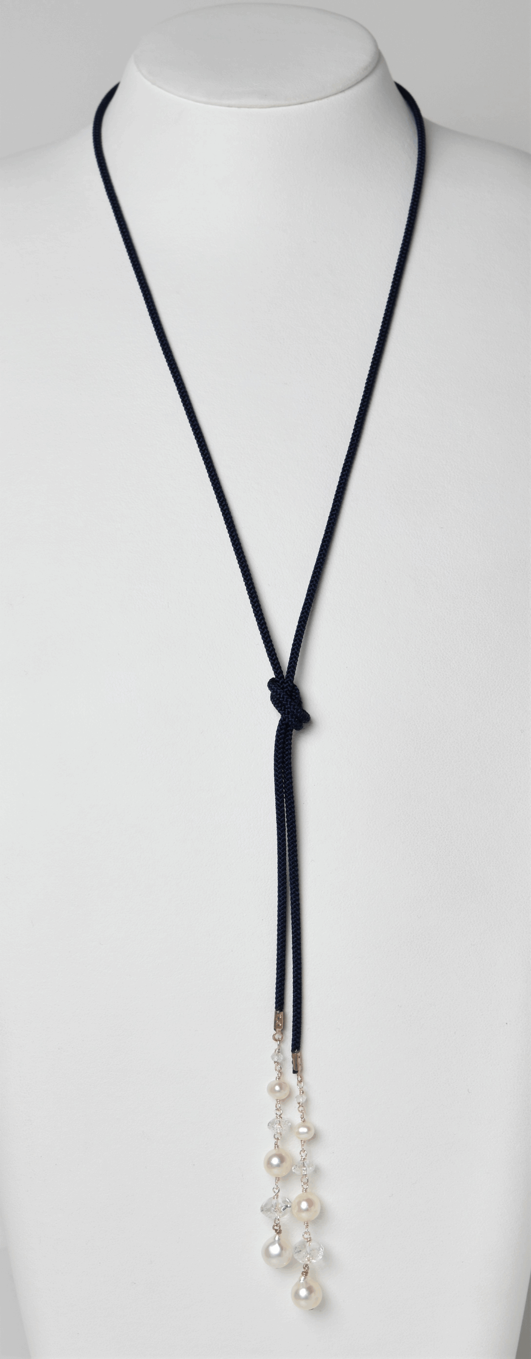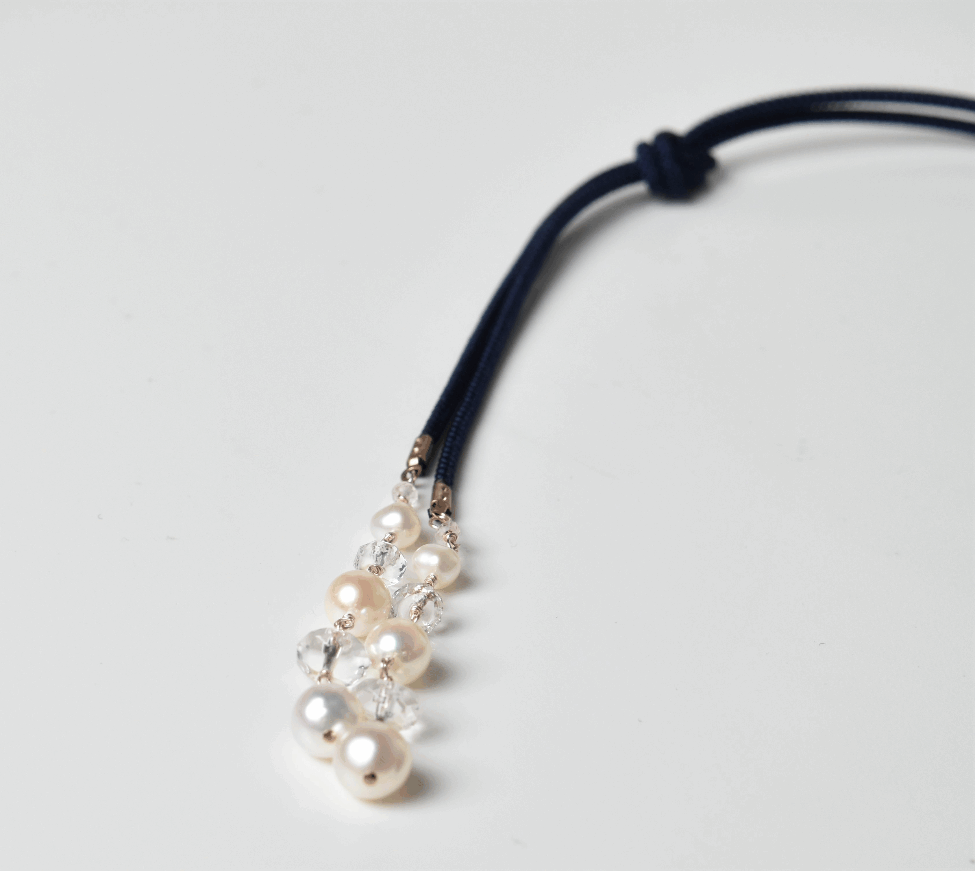 組紐を使ったあこや真珠ネックレスです。ラリエットとは留め具のない紐状のネックレスのこと。手前でくるりと結べば、胸元でパールと水晶がキラキラと揺れ、シンプルなお洋服や、ラフなスタイルにさらりと合わせても素敵です。京都産の組紐を使用しているため、結びじわが付きにくくなっており、チェーンのように堅くからまって慌てる心配もありません。大変使い勝手の良いネックレスです。