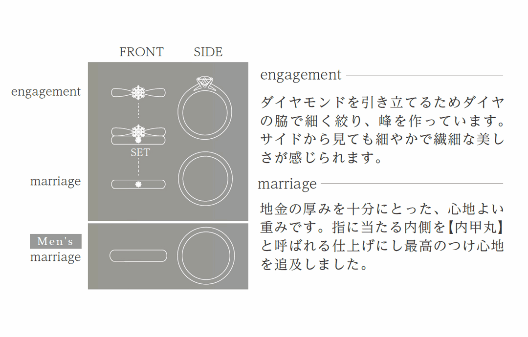FUJIMOTOオリジナルデザインエンゲージリングです。¨ストレートライン¨と名付けられたこのシリーズは、ダイヤモンドを引き立てるためにダイヤの脇で細く絞り、峰を作っています。サイドから見ても細やかで繊細な美しさが感じられます。