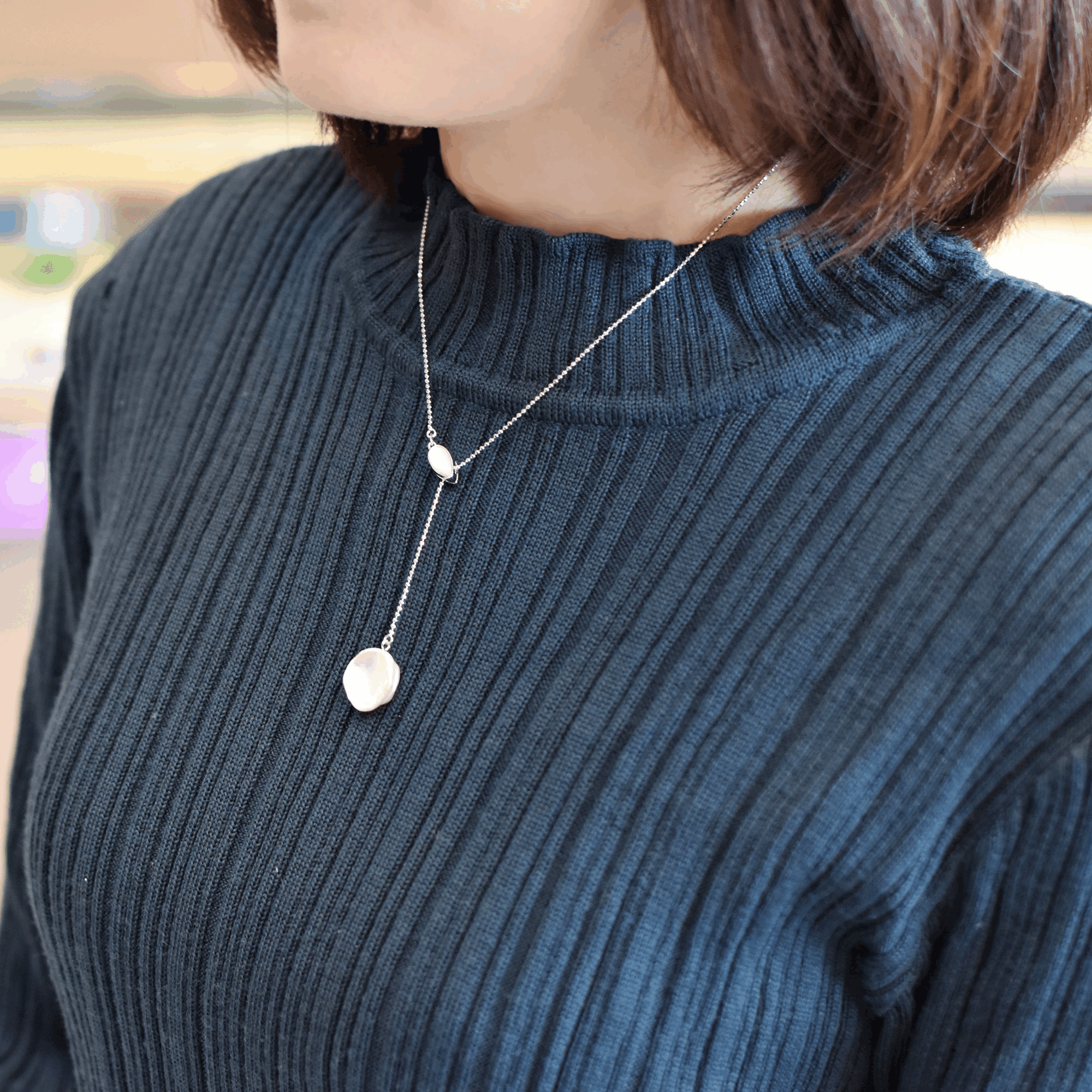 | サイズ | 淡水真珠直径約15mm前後、厚さ約2mm前後、チェーンSilver全長約45cm(クリップタイプ)、 |