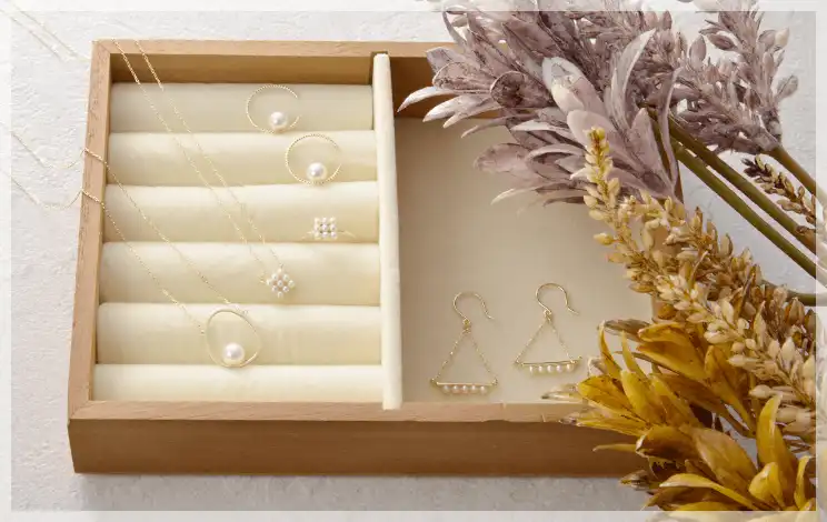 フォーマルな時にしか使えないという真珠のイメージですが、楕円形の枠を2個つないで内側に約5.5mmサイズの照りの良いあこや真珠を1珠付け、可愛らしく柔らかいデザインに仕上げることで、普段使いに最適な商品に仕上げました。