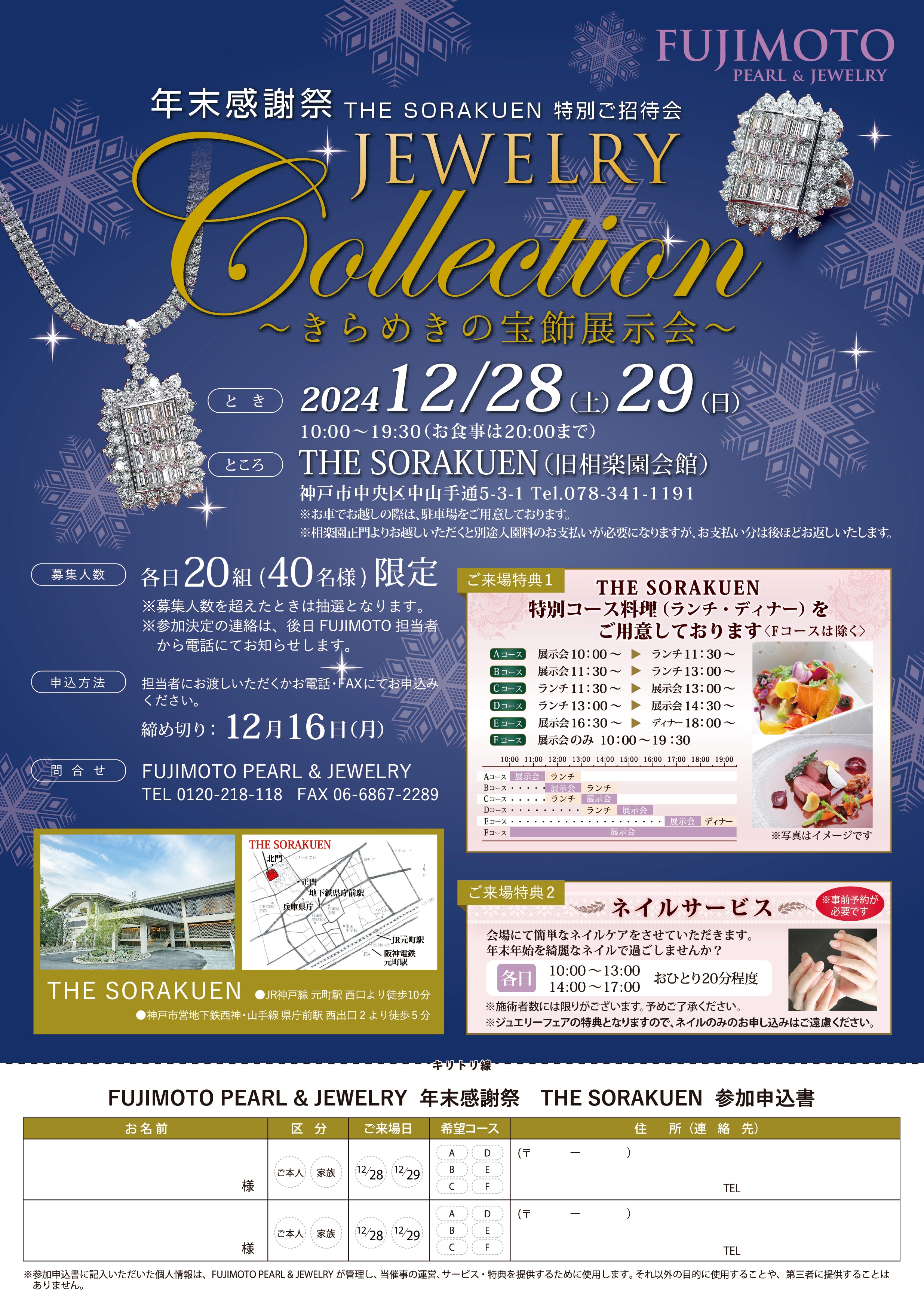 NEWS 2024.12.01 年末感謝祭【きらめきの宝飾展示会】のお知らせ 恒例の年末ジュエリーフェア【きらめきの宝飾展示会】を12月28日(土)29日(日)の二日間、神戸のTHE SORAKUEN(旧相楽園会館)にて開催いたします。ご参加ご希望の方は、お電話またはメールにてお問い合わせください。年末年始にふさわしい華やかなジュエリーをそろえて皆様のご来場をお待ちしております。 お知らせ一覧