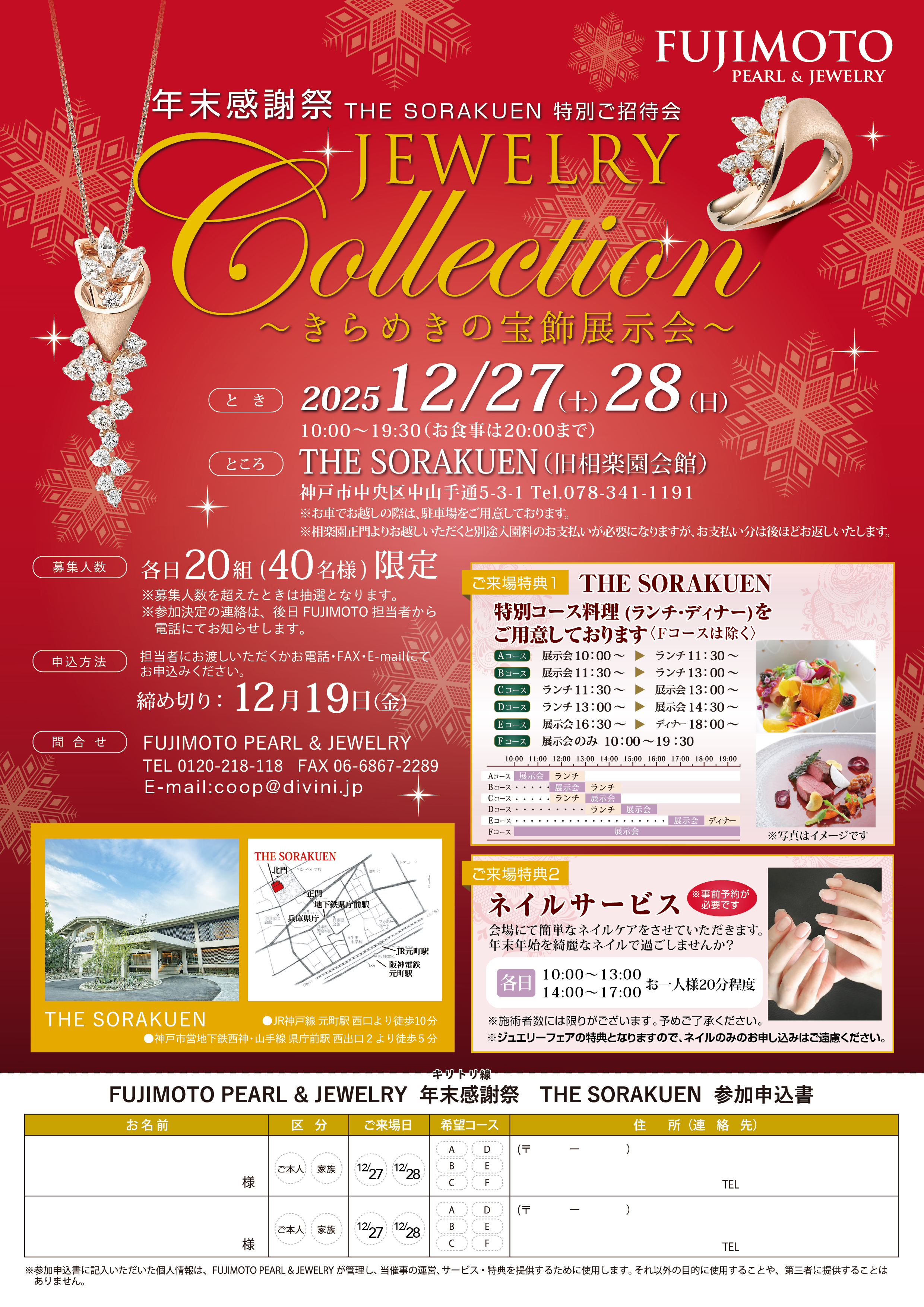 恒例となりました年末ジュエリーフェア【きらめきの宝飾展示会】を12月27日(土)28日(日)の2日間、神戸 THE SORAKUEN(旧相楽園会館)にて開催いたします。